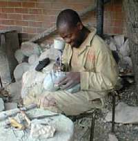 When we speak of "heating" and "burnishing," in the hurried world outside of Africa, we may tend to get an entirely erroneous impression of the processes used by the carvers of Zimbabwe. The illustration here shows a typical urban artist/craftsman at work smoothing and burnishing a carving.
